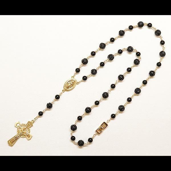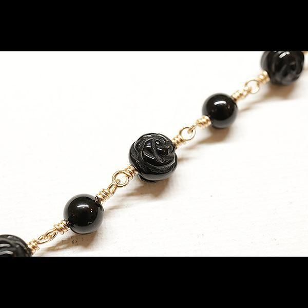 オニキス・薔薇彫りオニキスのビーズをめがね留めで丁寧に編み上げたロザリオネックレスです。