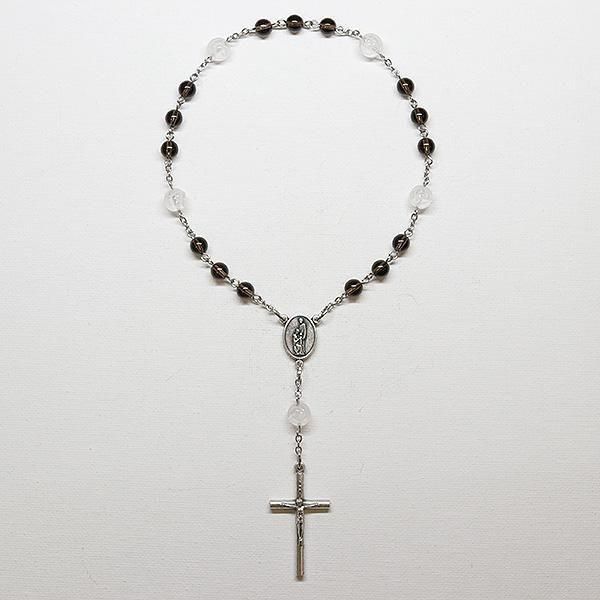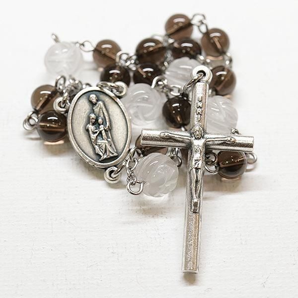 スモーキークォーツ6mm、薔薇彫りミルキークォーツ8mmを合わせたカルメル会のロザリオです。