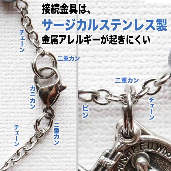 医療器具にも使用されるサージカルステンレス(ステンレス316)製の丈夫なピン・チェーン・カニカン・二重カンでビーズを繋いでいますので、